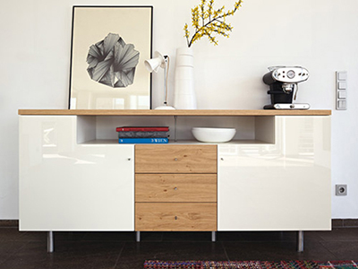 光沢のあるホワイトの扉にナチュラルなオーク材を組み合わせたモダンな印象のサイドボードです。天然オークの突板が表面材として使われ、上質さと優しさが感じられます。中央がオープンになったデザインは、お気に入りのアイテムを飾り付け、ディスプレイを楽しむのに最適です。リビングにもダイニングにもコーディネートしていただけ、空間を清潔感溢れる明るい印象にしてくれます。