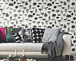 フィンランドを代表するファブリックブランド、マリメッコの輸入壁紙です。 白地に黒またはグレーで様々な木々が描かれた落ち着いた柄です。国産壁紙が約92cmであるのに対し、こちらの輸入壁紙は53cmなので、簡単に貼ることがで・・・